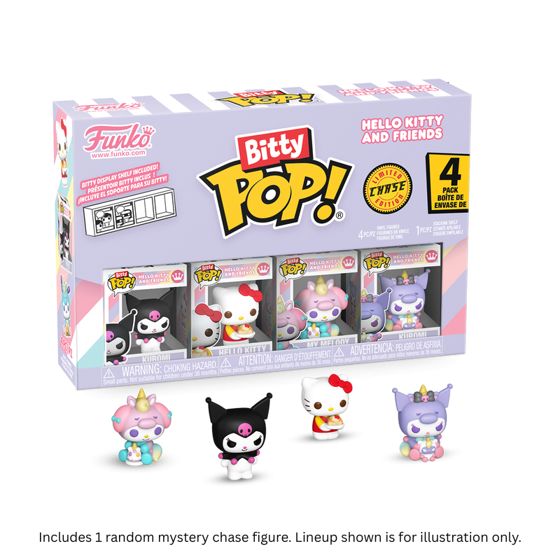 The world of Funko just got cuter—and smaller! This Bitty Pop! Sanrio Series 3 4-Pack features miniature versions of Kuromi, Hello Kitty (Dessert), and My Melody (Unicorn), along with a surprise chase figure hidden inside. Each figure stands just under an inch tall and comes in its own acrylic case with a stackable display box included. With rare and hyper rare chase variants like Chococat, Tuxedosam, and Hello Kitty with glasses, these adorable collectibles are perfect for Sanrio fans and mini Pop! lovers alike.
